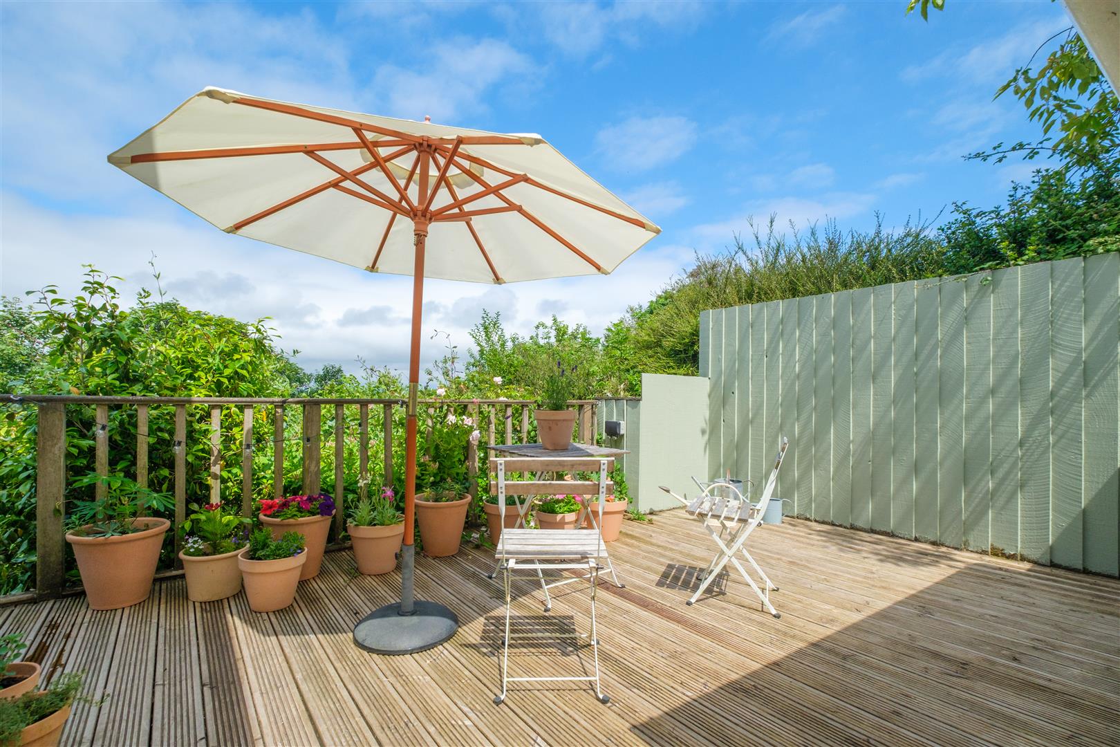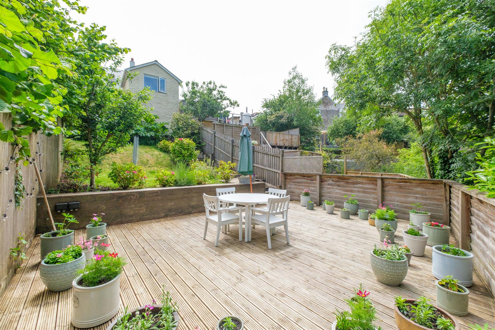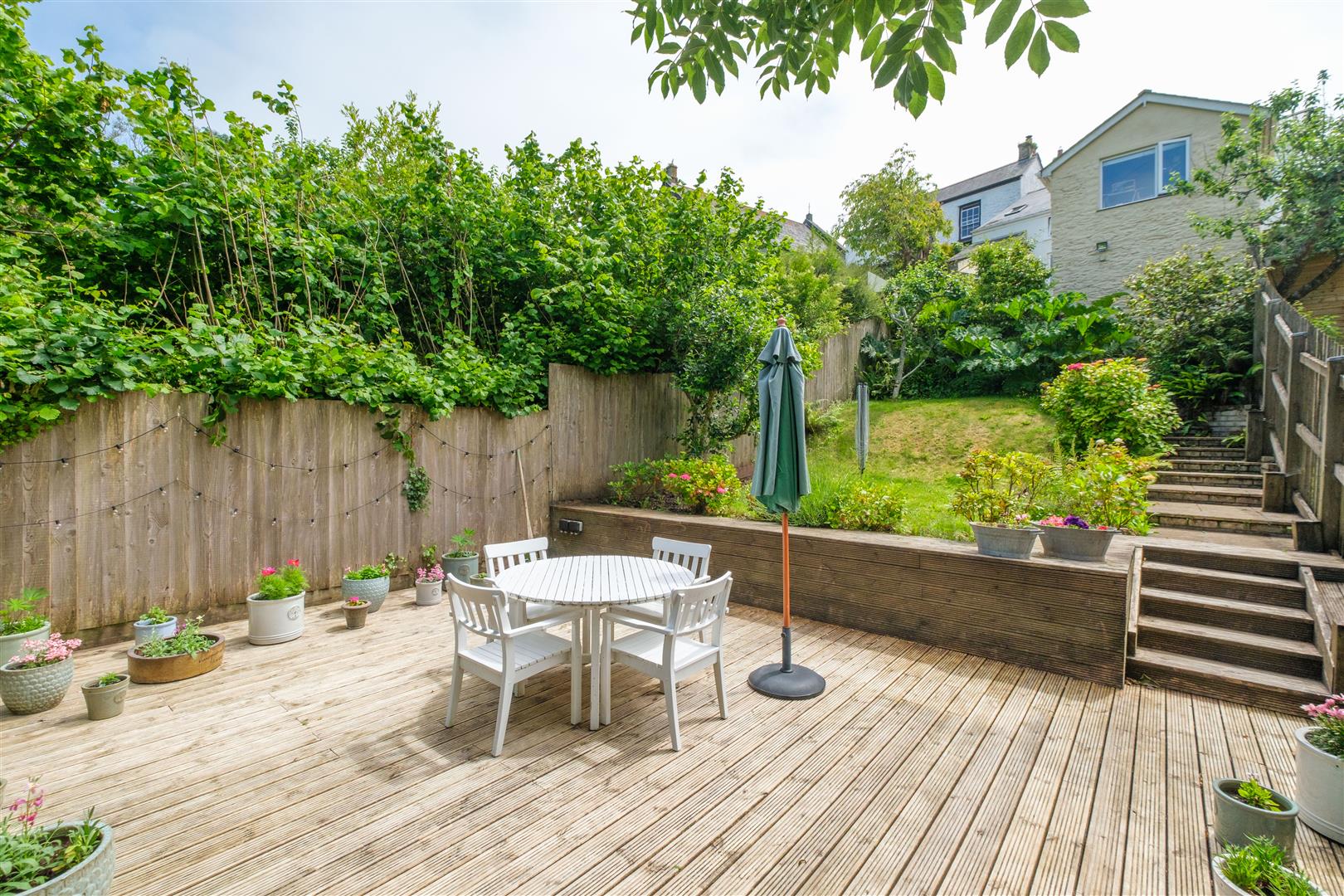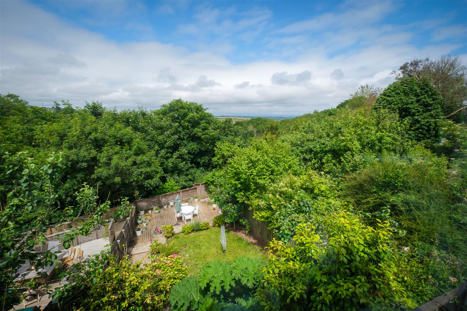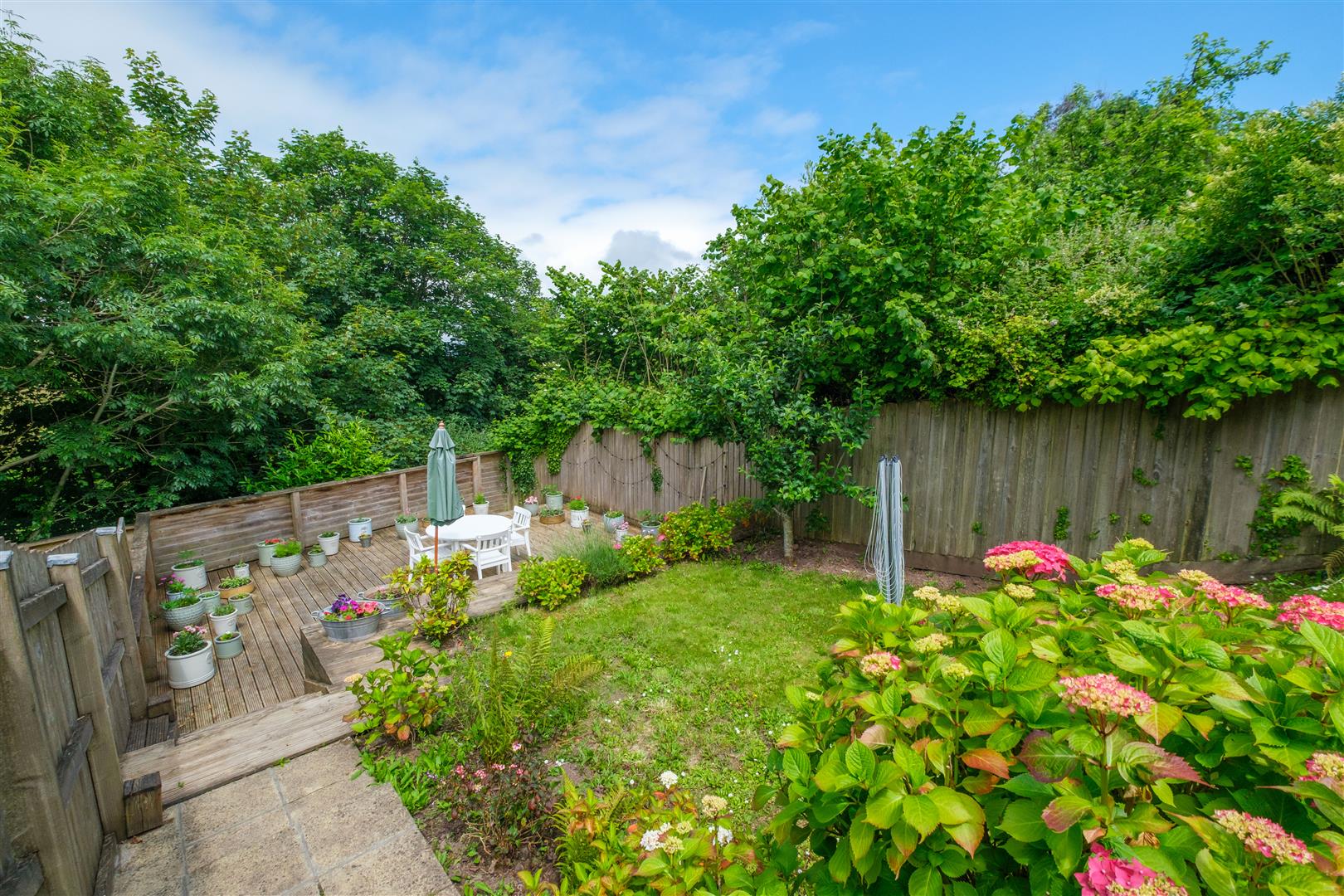 The enclosed rear garden provides a sheltered and secluded environment with lawn and established shrub beds together with two decked patios. A pedestrian gate at the end of the garden provides convenient access to a charming public footpath along Coombe Lane.