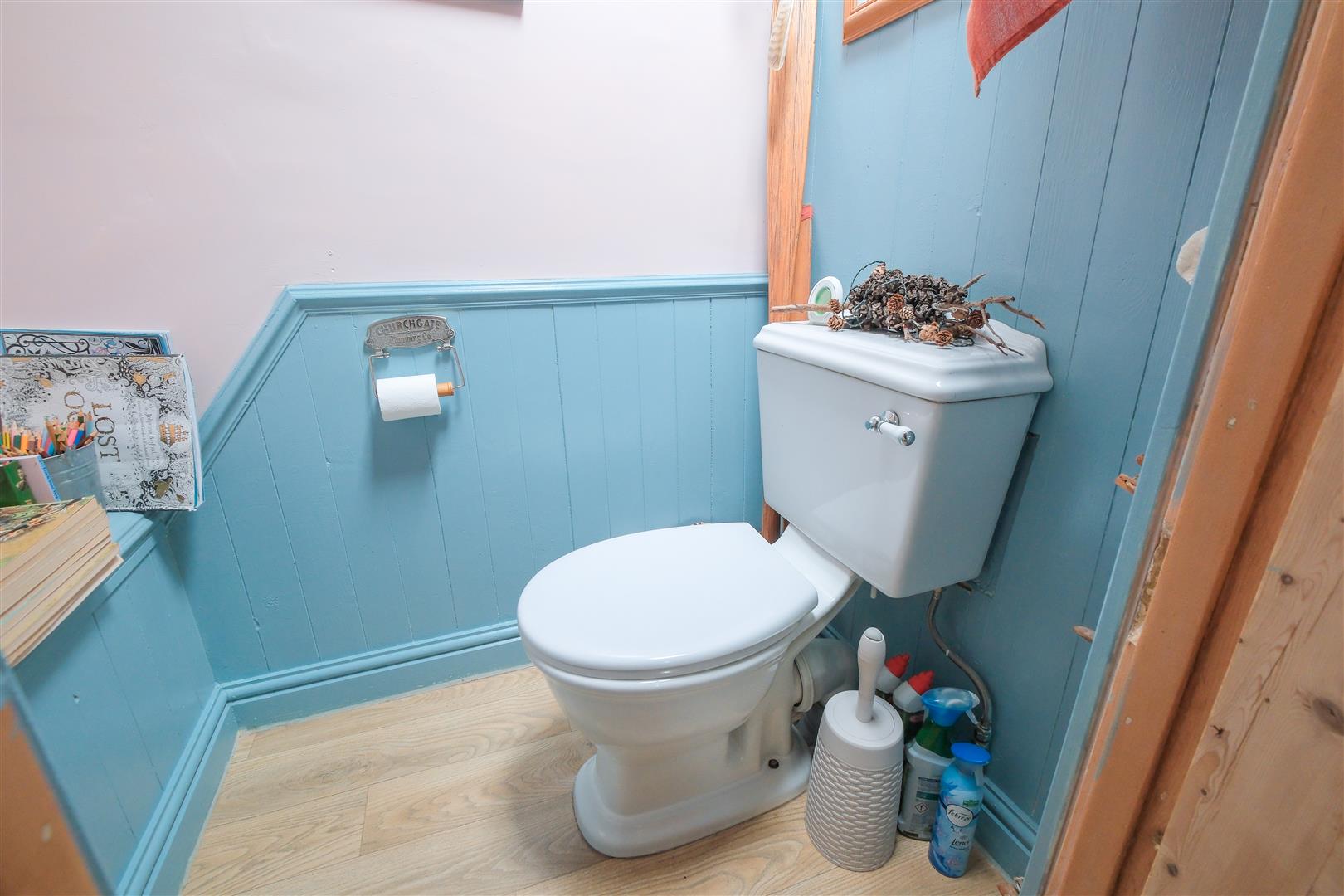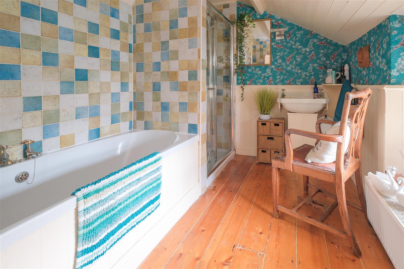 The rear garden is enclosed and walled providing a secluded environment with slate paved and sleeper decked patio area and steps leading up to a lawn with established tree, shrub and flower beds. Two outside taps. Dog shower.