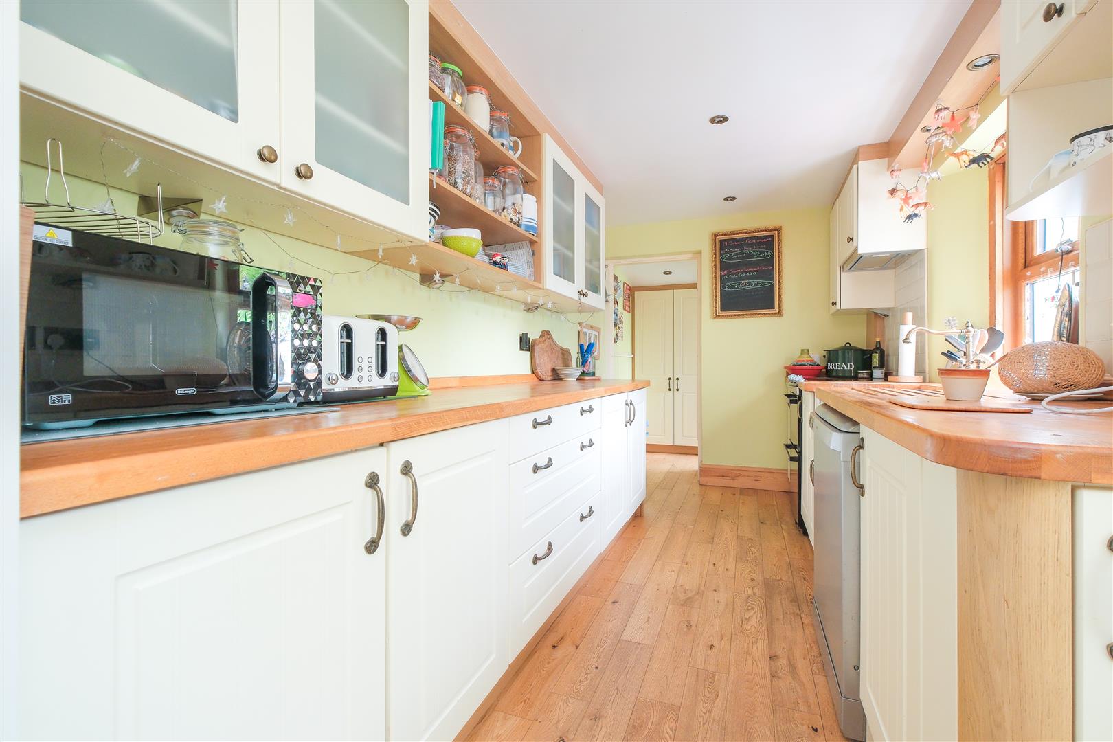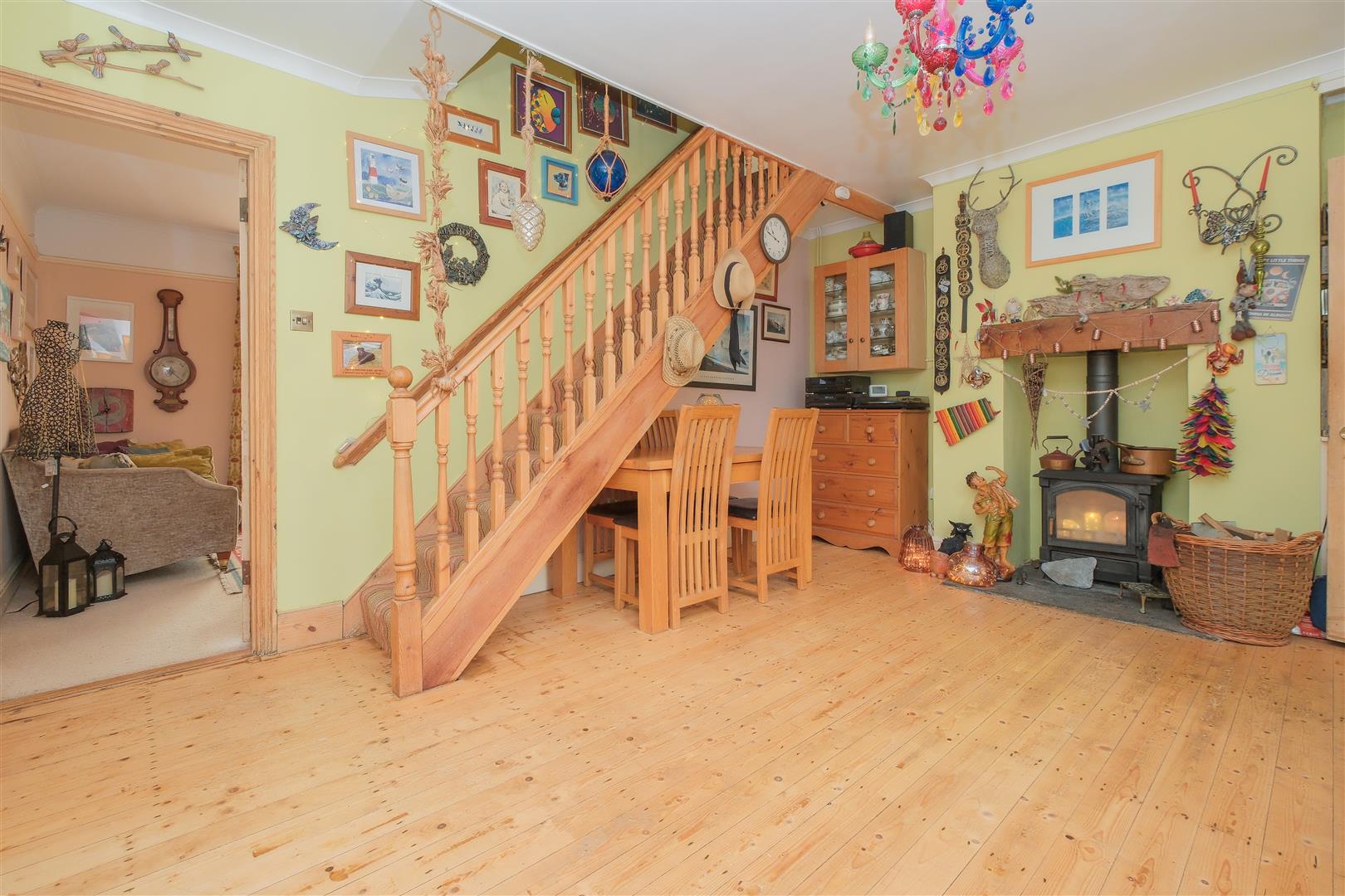 The layout is demonstrated by referring to the floorplan extending to about 1464 sq ft and briefly comprising – entrance door to lobby in turn opening to the dining/family room with staircase off and open fireplace housing a wood burner, in turn leading to the kitchen with range of oak worksurfaces and built in cabinets. The sitting room has an open fireplace and French doors opening to the sun room with tiled floor and French doors to the garden, sea views can be observed from this room.