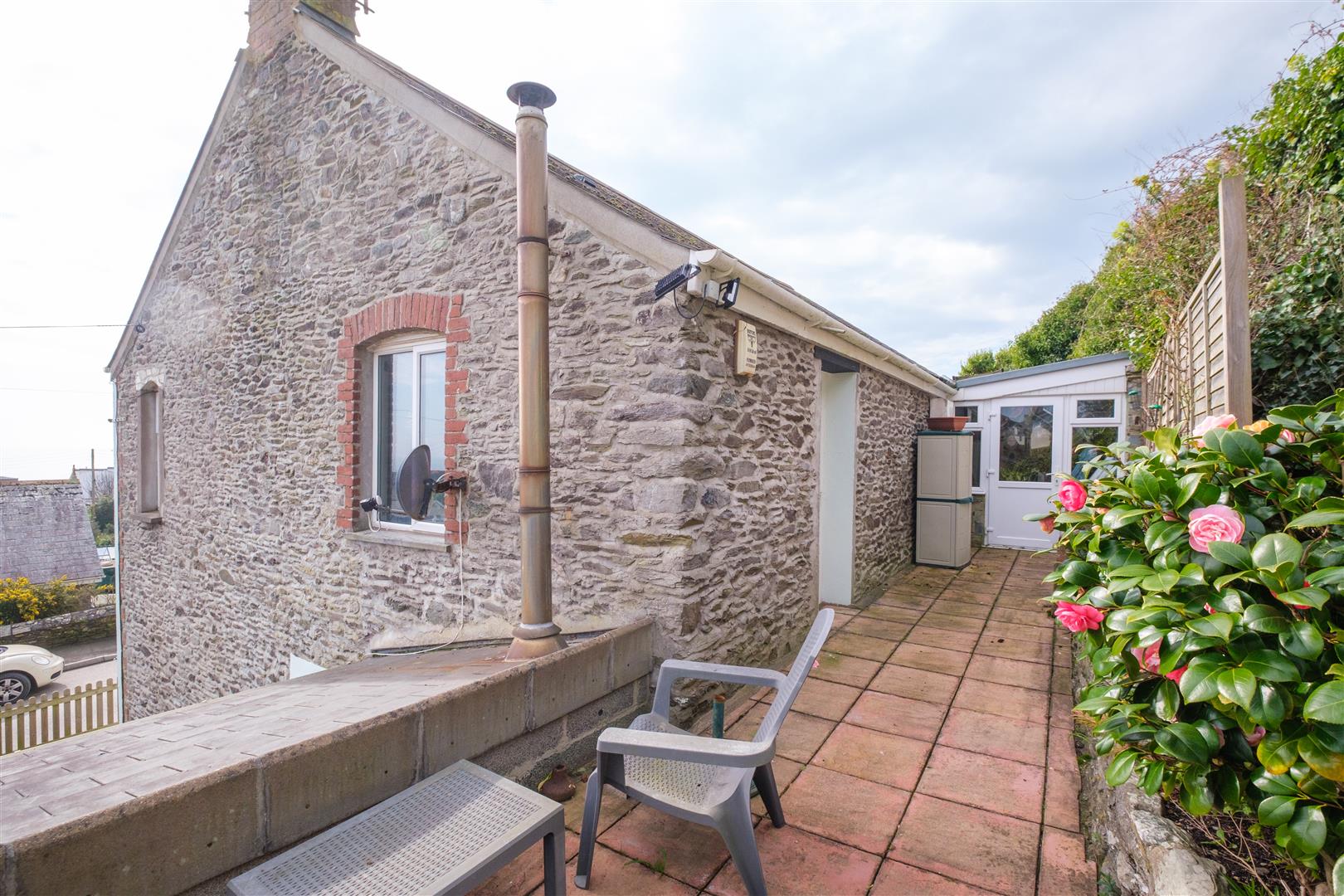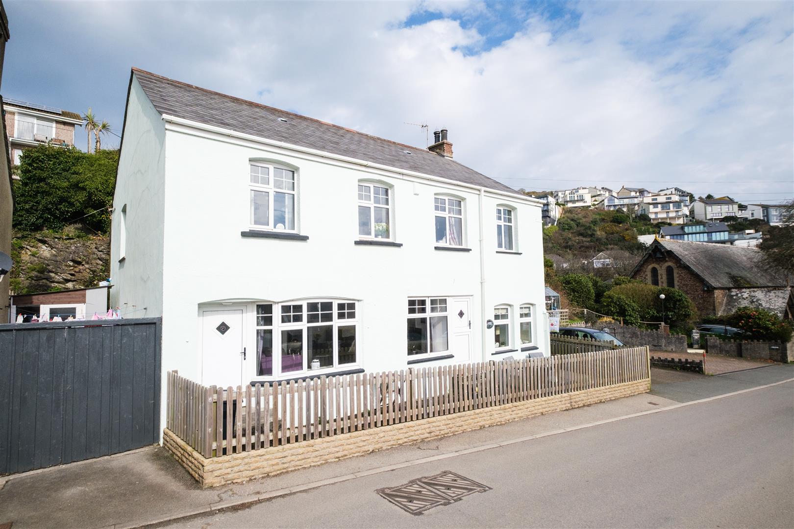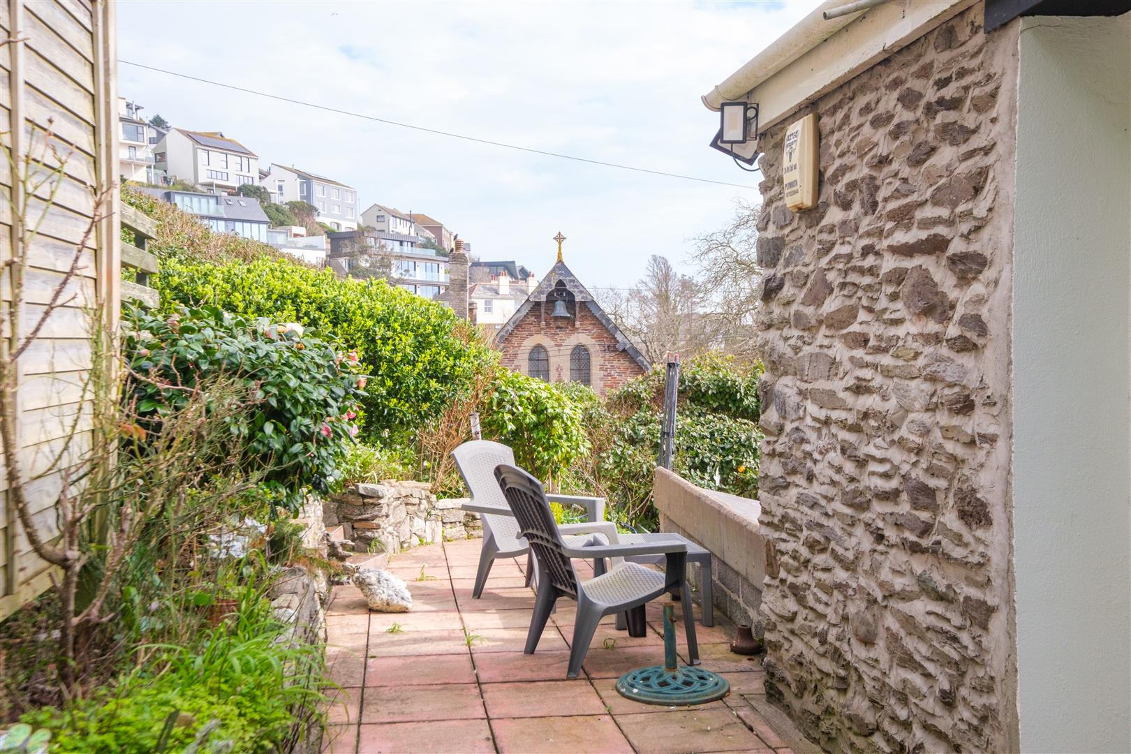 Private parking for two cars. The gardens are low maintenance with a courtyard to the front and steps rising up the rear with various seating areas with sea views. Established flower and shrub beds. Greenhouse. An outbuilding to the rear could be suited to use as a studio or work from home space.