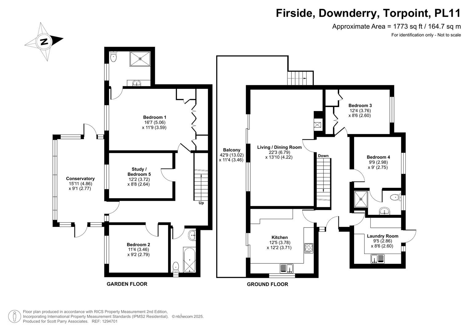 The property extends to about 1773 sq ft and briefly comprises – GROUND FLOOR – Reception Hall – 12′ Dual Aspect Kitchen/Breakfast Room with access to the 49′ long Balcony – 22′ Sitting/Dining Room with wood burner and patio door to the Balcony – 2 Double Bedrooms (1 Ensuite) – Laundry Room – GARDEN FLOOR – Spacious Hallway – 16′ Conservatory – Study/Bed 5 – 17′ Principal Bedroom with wardrobes and Ensuite Shower Room – Further Double Bedroom (total 4/5) – Family Bathroom.