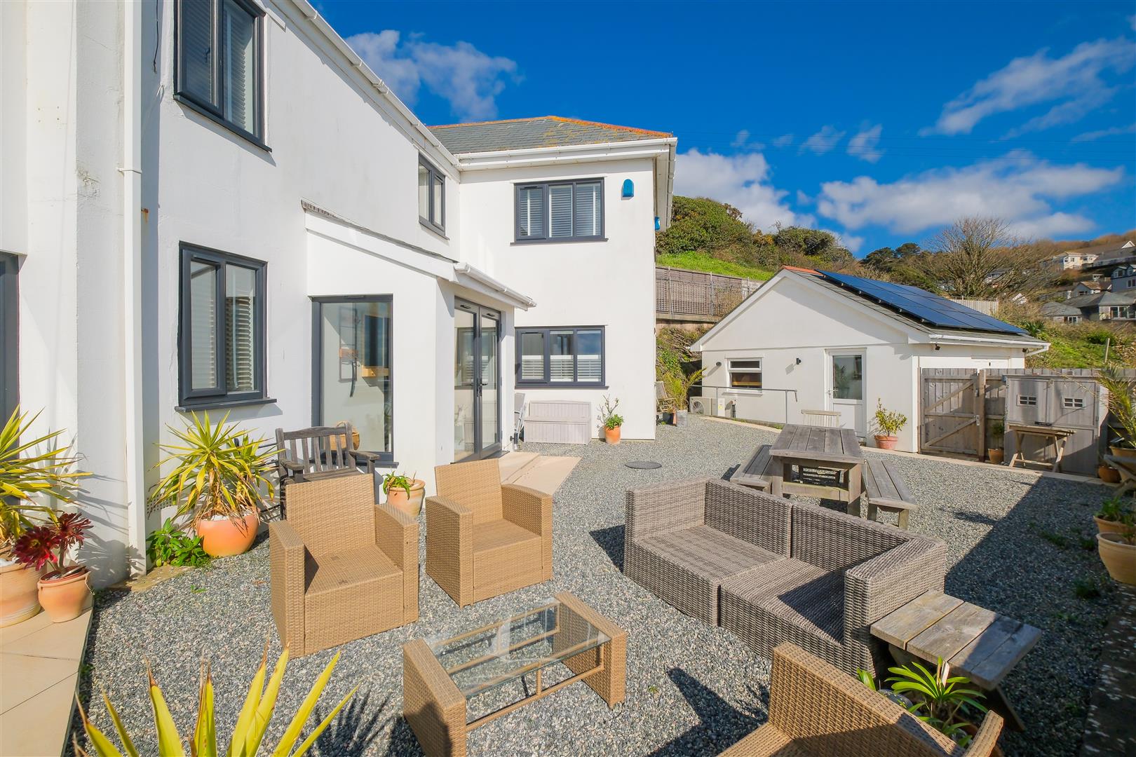 A fabulous near beachside garden apartment with studio/guest suite offering spacious contemporary accommodation. The apartment commands a stunning panorama over the sparkling waters of Whitsand and Looe Bay and is only 175 yards from Downderry Beach. About 793 sq ft, 28′ Open Plan Living Room/Kitchen/Sun Room, Balcony, 2 Bedrooms (Both Ensuite), Parking, Garage, Extensive Sea Facing Terrace/Patios.