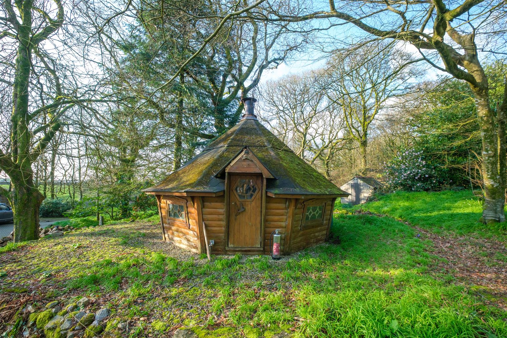 A long private drive leads to a large and level parking area for many cars with space for boat., motorhome, caravan etc. This gives access to the various outbuildings including a very large three bay garage (one bay of which has been used as a superb home bar/entertaining space), 2 further garage/workshops, a log store and a Barbecue Hut. The extensive and mature gardens provide a secluded environment and are host to an abundance of natural flora and fauna. Adjacent to the house there are decked and patio areas with lawns and established trees and shrubs. There is an orchard and mature woodland with the whole extending to about 4 acres.