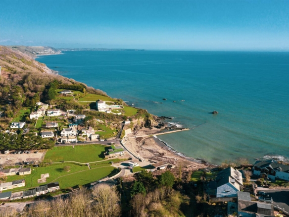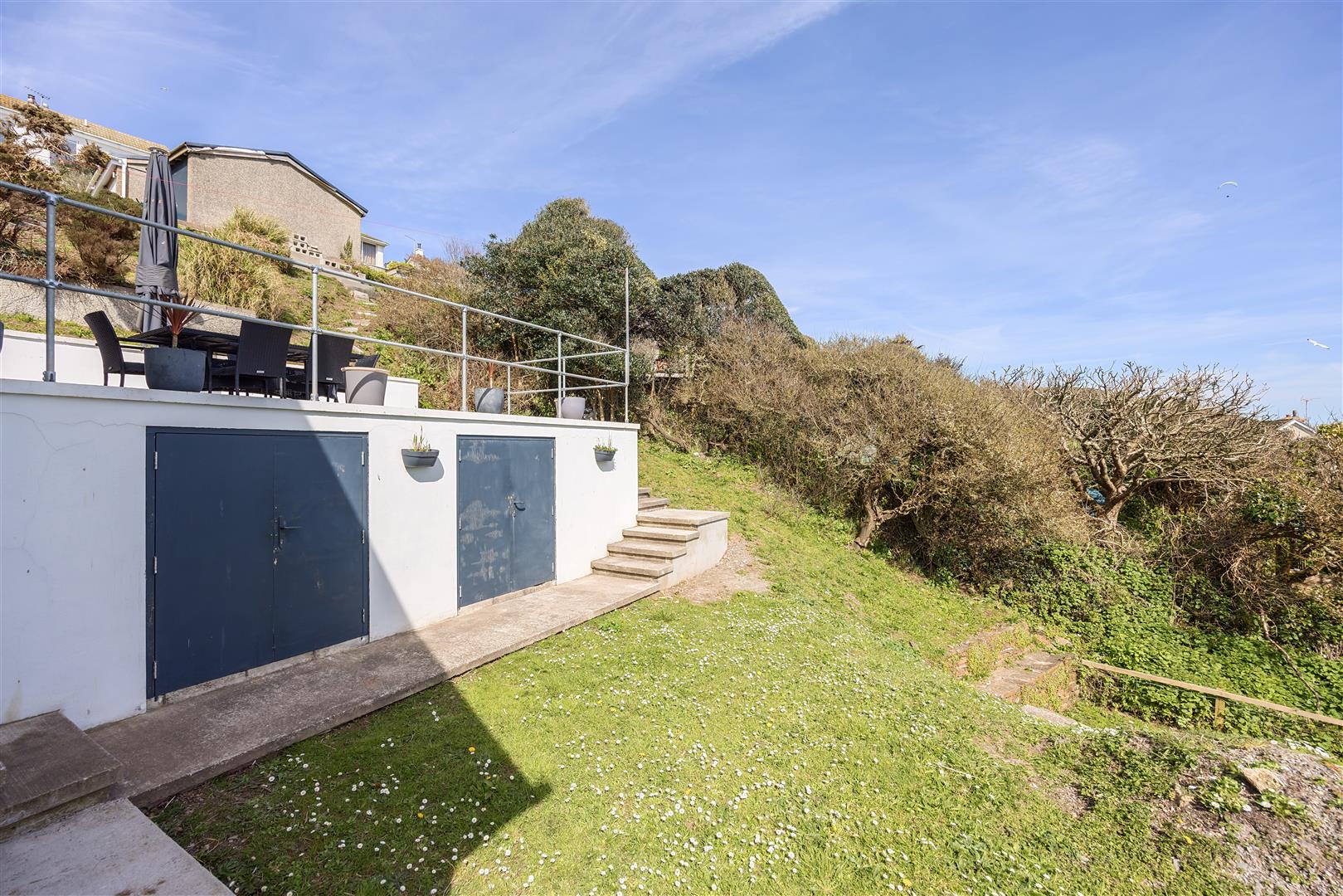 The generous gardens have an open south aspect with fabulous sea views. There are two large sea facing terraces (one with porcelain paving) totalling about 950 sq ft and providing superb space for sun bathing and entertaining. There are two garden stores (one provides access to the small under house cellar). The remainder of the garden is lawn with various trees and shrubs.