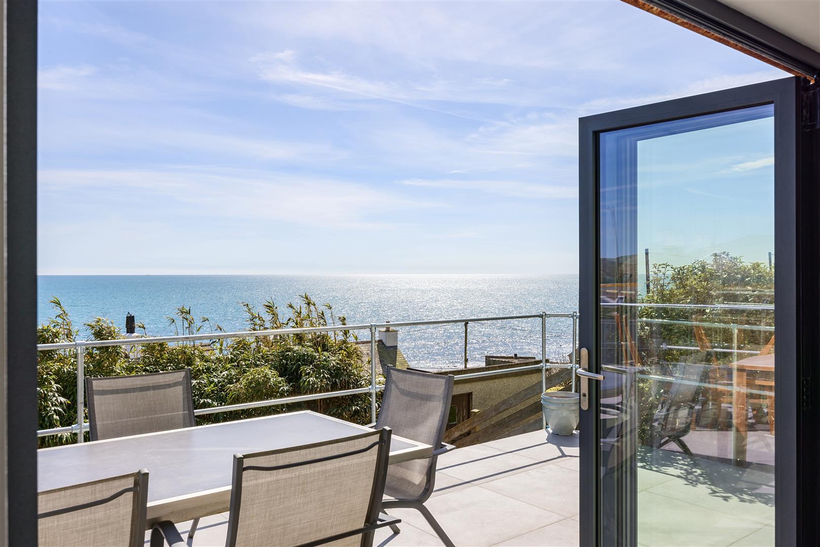 A beautifully presented and south facing contemporary marine residence offering spacious accommodation, conveniently located only 250 yards from the beach and commanding a stunning 180 degree prospect over the sparkling waters of Whitsand Bay. About 1345 sq ft, 31′ Open Plan Living Room/Kitchen, Principal Bedroom with Ensuite Shower Room/WC, 3 Further Double Bedrooms, 2 Bath/Shower Rooms, Laundry Room, Parking, Garage, Gardens, 950 sq ft of Sea Facing Terraces.