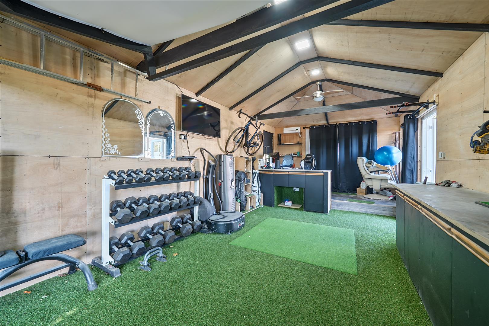 The property is approached over a private level driveway providing parking for 2/3 cars and leading to the large garage/workshop 22’8″ x 11’9″ (266 sq ft) with electric roller door and lean-to mower shed. The garden is lawned with well stocked raised flower beds and limestone paved sun terrace.